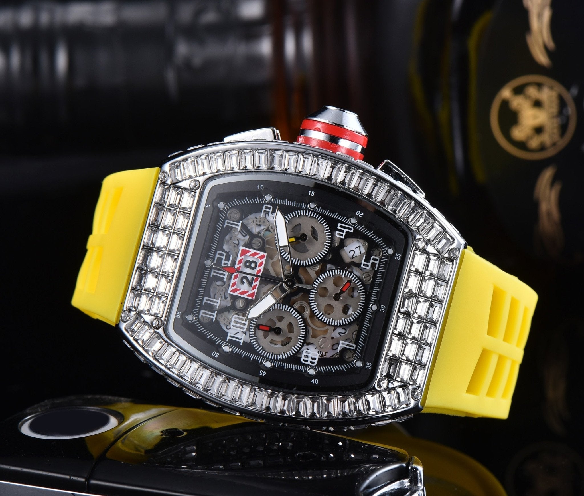 The stunning 18k Gold Baguette Diamond Mechanical Watch, a true masterpiece of luxury timekeeping. Crafted from the finest materials and featuring a mesmerizing array of diamonds, this watch is sure to impress even the most discerning of watch enthusiasts.